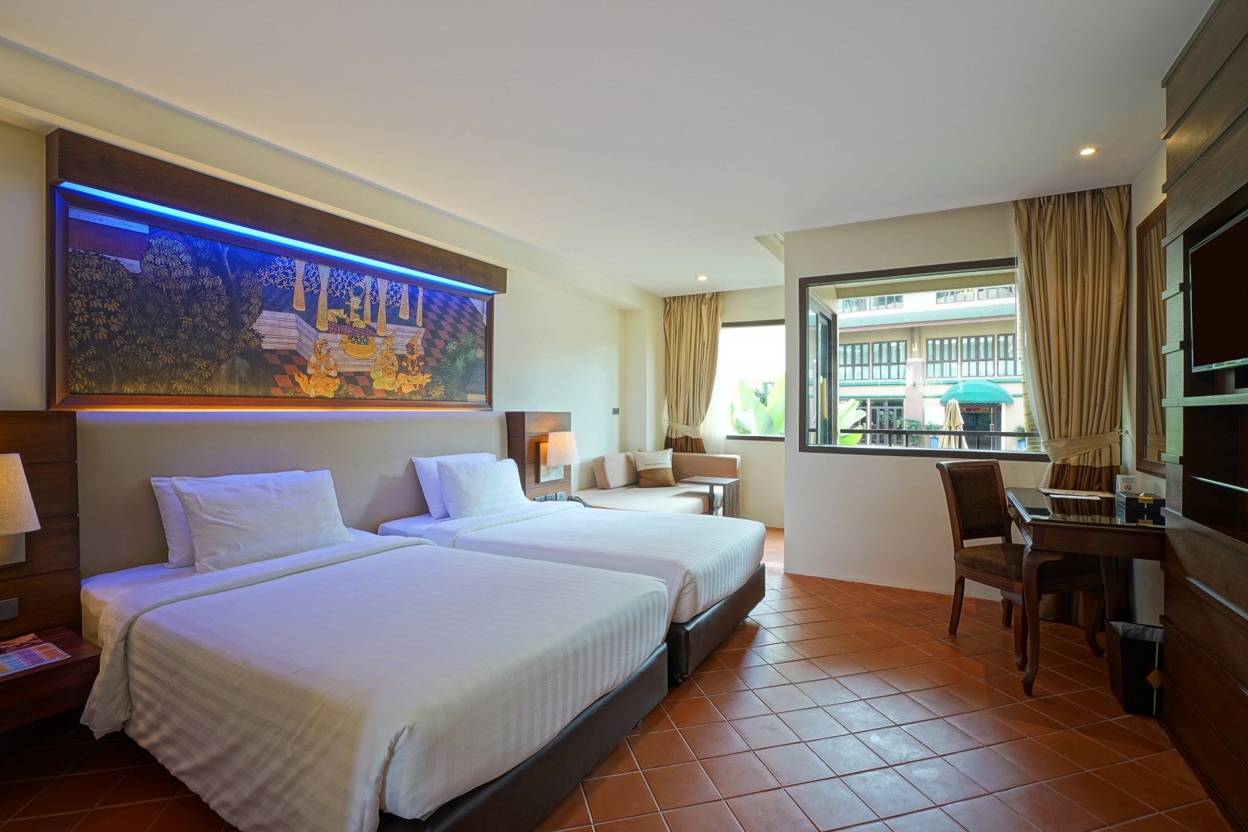 ノボテル・プーケット・ビンテージパークで最もベーシックなお部屋です、コストを抑えてたい方にオススメなお部屋です。33㎡の室内はノボテルらしいシンプルで落ち着いたモダンなデザインのお部屋です。コンパクトに必要な設備が整い、ノボテルブランドの豊富なアメニティーが揃っています。お部屋はキングサイズベッド1台かシングルベッド2台か選べるようになっています。